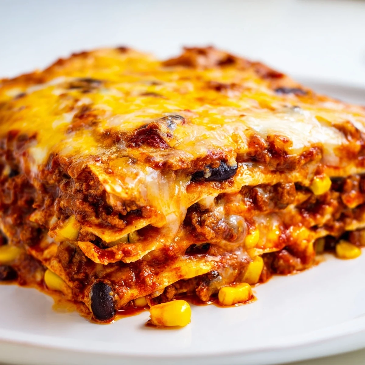 This hearty Tex-Mex casserole layers seasoned ground beef with corn, black beans, and aromatic spices between soft corn tortillas. Everything gets smothered in red enchilada sauce and a blend of cheddar and Monterey Jack cheeses, then baked until bubbly and golden. The result is a comforting, cheesy dish that's easier than rolling traditional enchiladas but delivers all the same bold flavors.