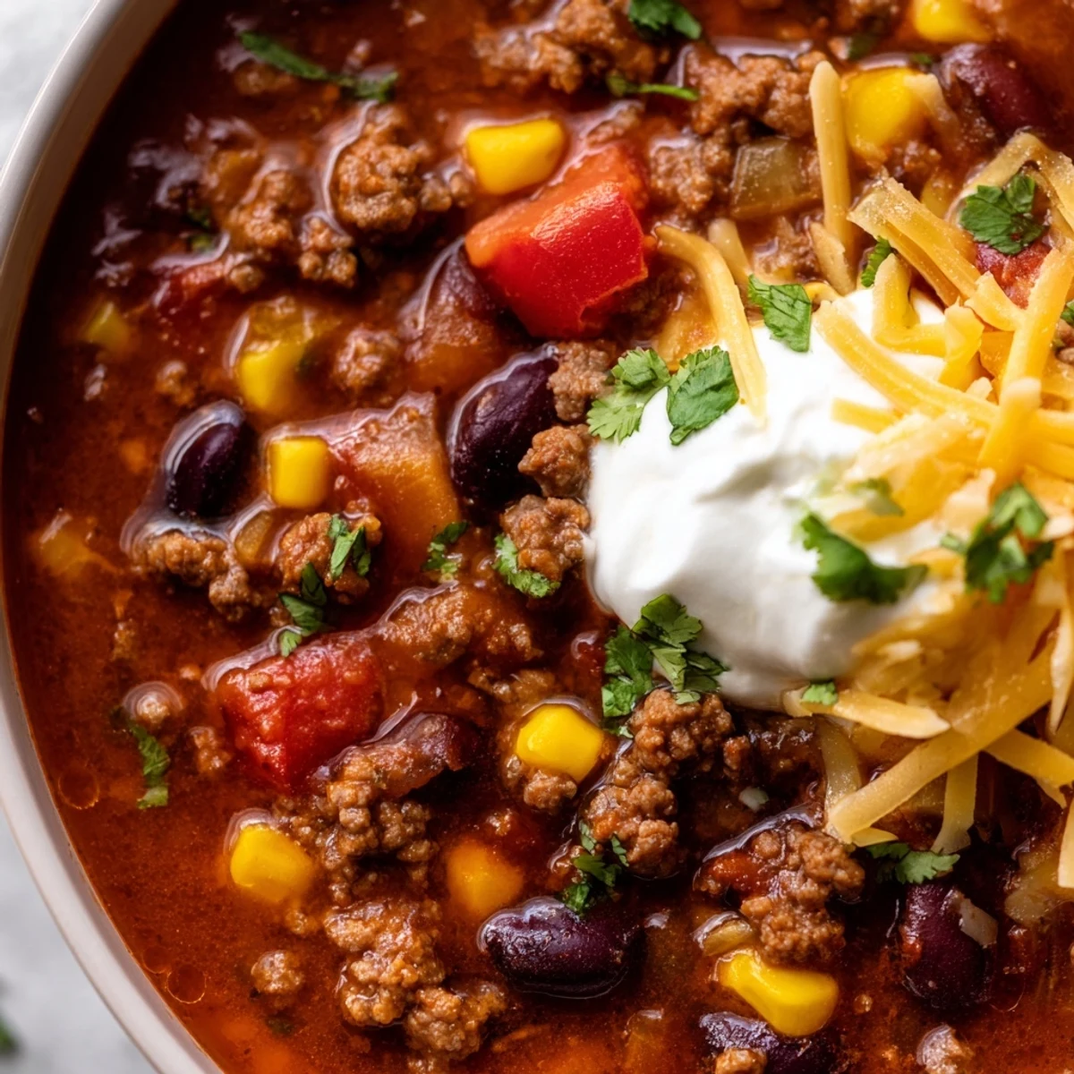 This hearty soup combines seasoned ground beef with black beans, kidney beans, corn, and diced tomatoes, all simmered in a beef broth infused with taco seasoning, cumin, and black pepper. The slow cooker melds these flavors beautifully over six hours, creating a rich, satisfying meal that's perfect for busy days.