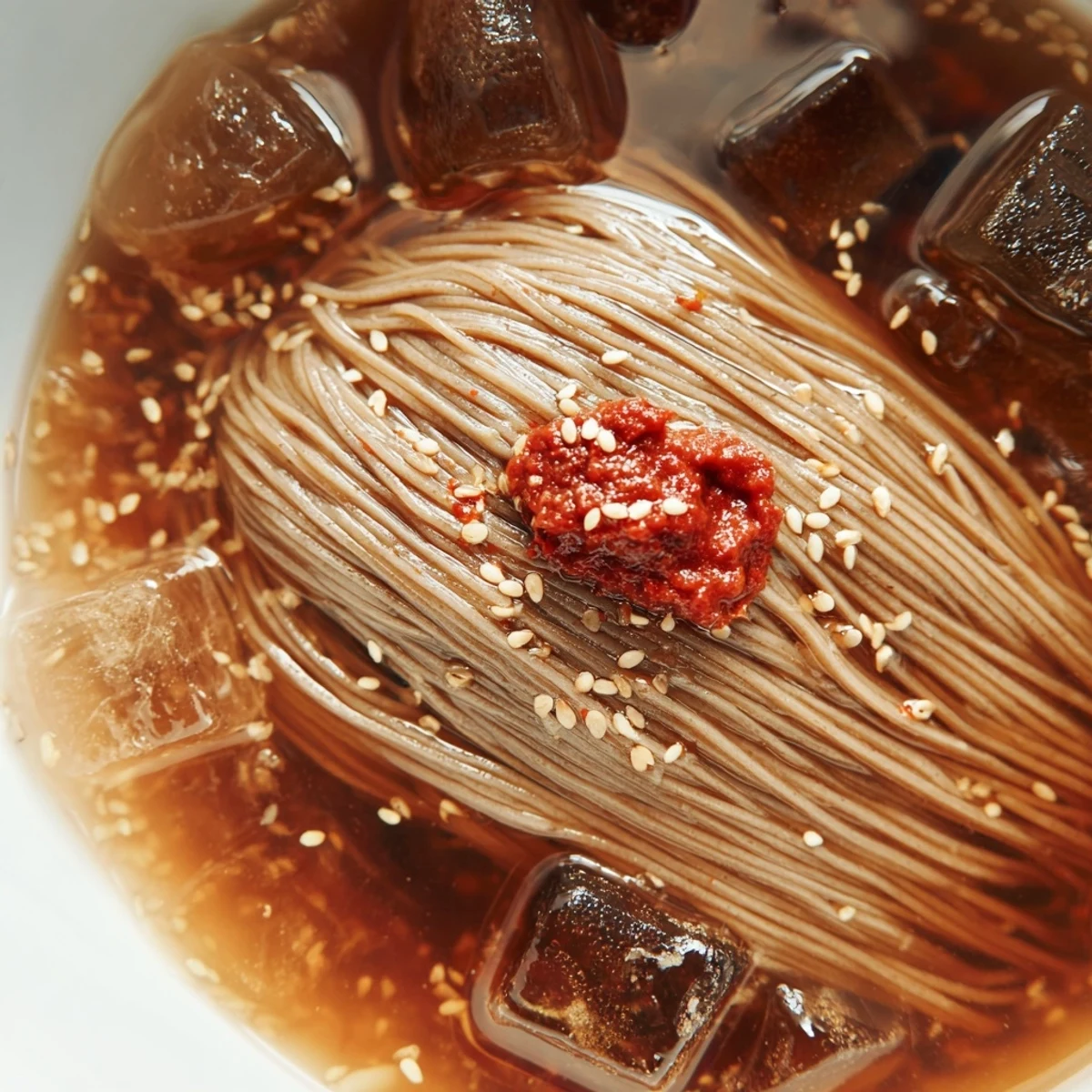 Ice cubes are essential for maintaining the bracing cold temperature that defines naengmyeon. As the ice melts, it also slightly dilutes the broth, creating a more delicate flavor profile while keeping the dish refreshingly cold until the last bite.