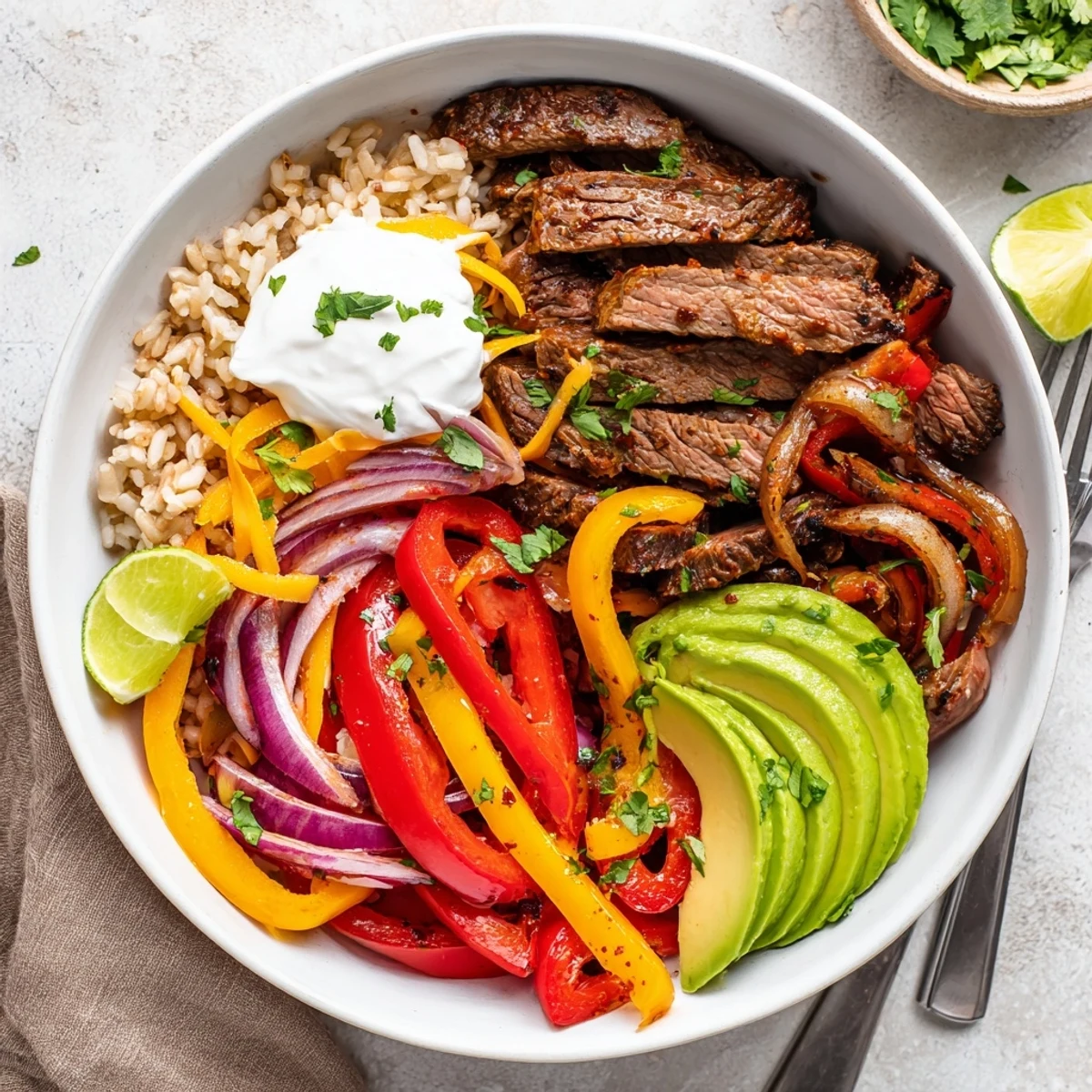 Marinate thinly sliced flank or sirloin in lime, soy, garlic and spices, then sear briefly for juicy slices. Saute a trio of bell peppers and red onion until tender. Warm black beans and brown rice or quinoa. Assemble bowls with rice, beans, steak, peppers, avocado, cherry tomatoes and cheese. Finish with cilantro, lime wedges and a dollop of Greek yogurt or sour cream; swap cauliflower rice for a lower-carb option.